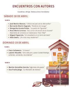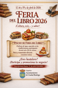 Del 17 al 19 de Abril, Ciudad Rodrigo, acoge una nueva edición de la Feria del Libro Fernando Arrabal, dando comienzo el dia 17 a las 12:00h en el edificio de la UNED, un taller de escritura. A las 19:30 el Palacio de Montarco, acogerá la inauguración oficial de la feria, con un concierto de Astrolabio y el discurso de Juan Francisco Blanco González.